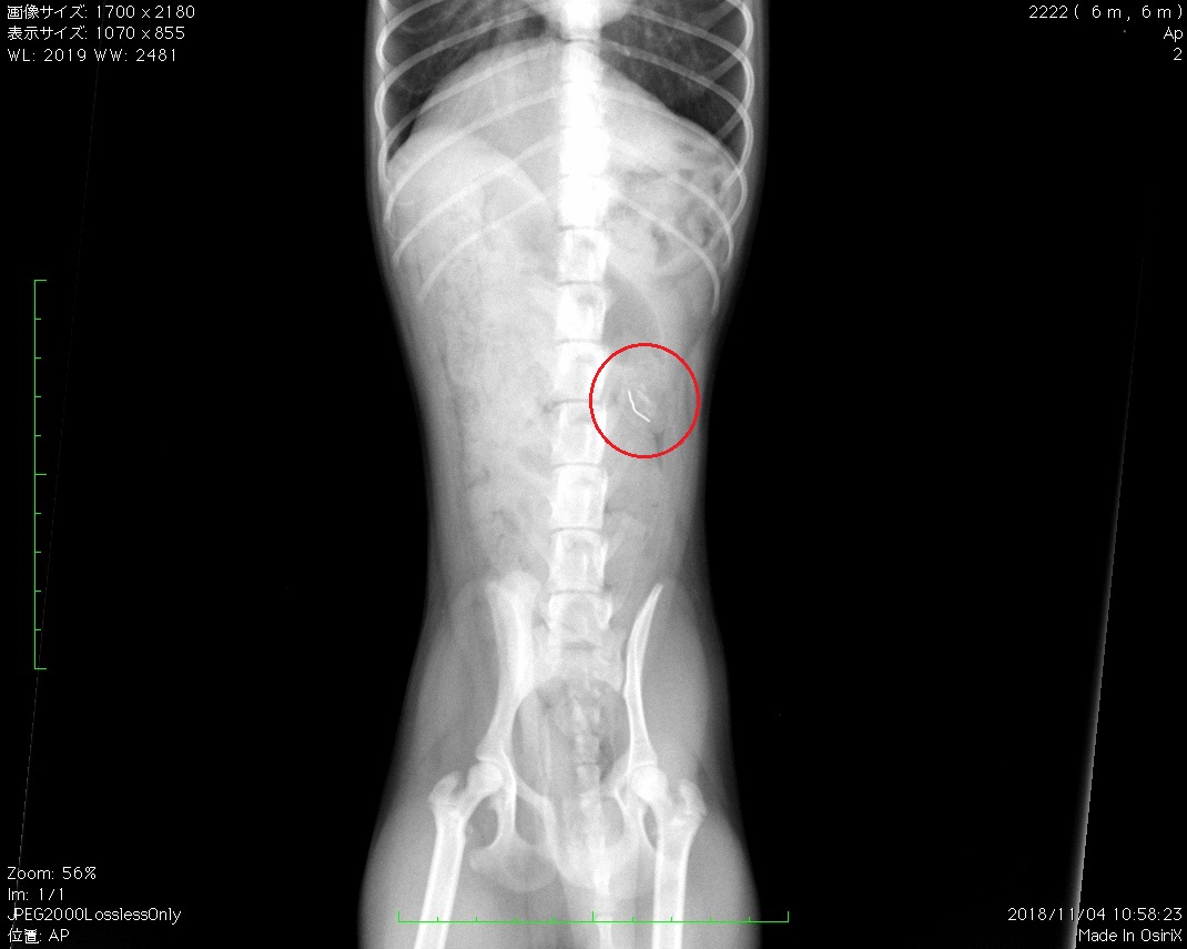 ゲーム機のコードを噛みちぎっていた。飲み込んだかもしれないとのことで来院。